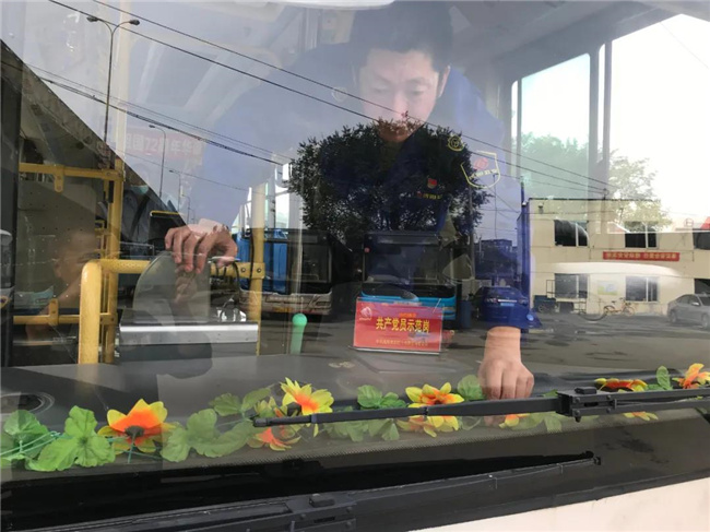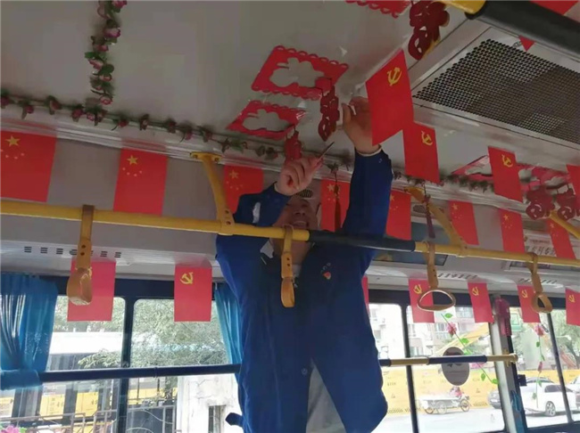 249車隊(duì)迎國(guó)慶,圖為新黨員駕駛員王眾裝飾“黨員服務(wù)質(zhì)量大提升示范崗”車廂。