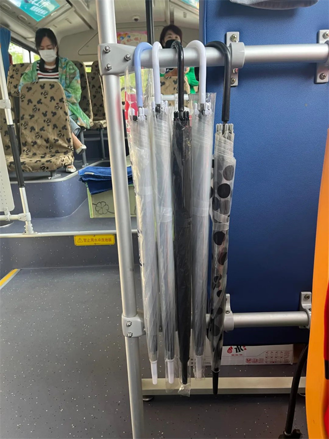 車內(nèi)雨傘、礦泉水、消毒液、消毒濕巾、口罩等一應(yīng)俱全,車身上還懸掛有“高考愛心服務(wù)車 217路為您服務(wù)”等字樣的條幅,這是張玲為了參與愛心助力高考活動,提前精心布置的車輛。