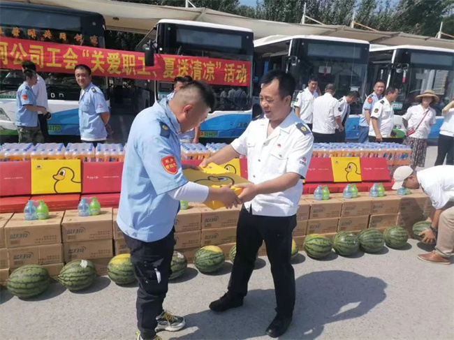 7月26日是二伏的第一天,酷暑難當(dāng)。黃河公司由工會牽頭、領(lǐng)導(dǎo)班子帶隊,在西江街公交樞紐站開展了“關(guān)愛職工、夏送清涼”活動?;顒又校绢I(lǐng)導(dǎo)班子將購置的飲料、礦泉水、浴巾、毛巾、西瓜、洗手液等防暑降溫及清潔物品,分發(fā)給公司公司所屬14個車隊的22條線路、及機關(guān)、車間。