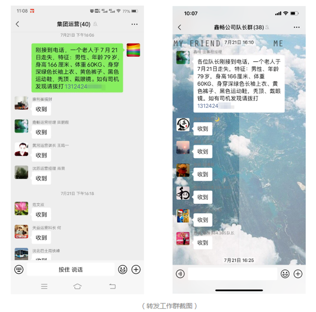 7月21日,沈陽客運集團(tuán)運營部接到市民求助電話,請求幫忙尋找一名走失的老人。運營部立即將求助信息發(fā)送至各運營單位,由各運營單位轉(zhuǎn)發(fā)至各線路隊長,再由各隊長轉(zhuǎn)發(fā)至各車隊微信工作群。