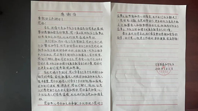 王卉珊的暖心善舉讓文官街道和平社區(qū)的書記深受感動(dòng),社區(qū)書記特地寫了一封感謝信,來(lái)到212路車隊(duì)親手交到王卉珊手中,向王卉珊表示最誠(chéng)摯的謝意和崇高的敬意。