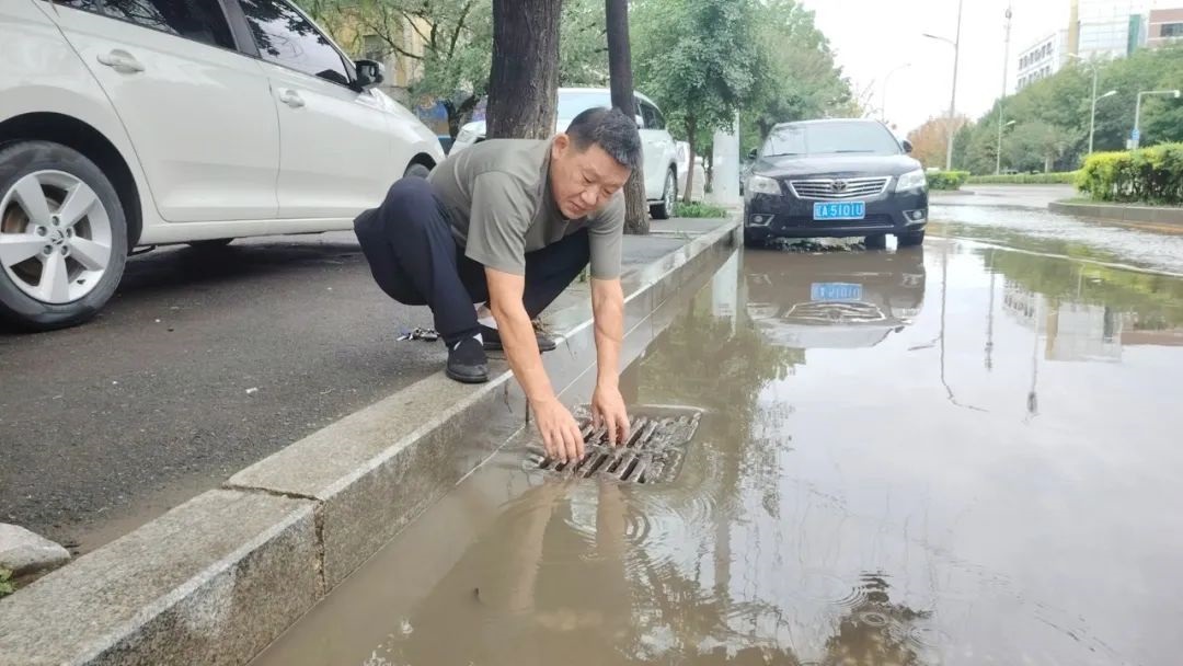 下了幾乎一夜的雨將254路車隊門前道路幾乎淹沒,254路車隊長劉佳寧拿起鐵鍬等工具,對下水道附近的污垢進(jìn)行清理,排除積水。