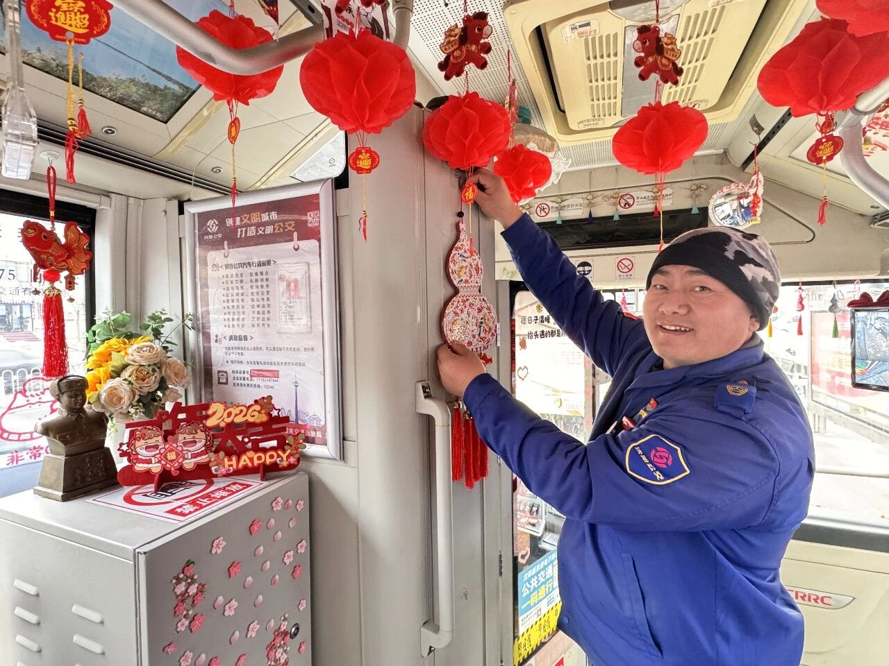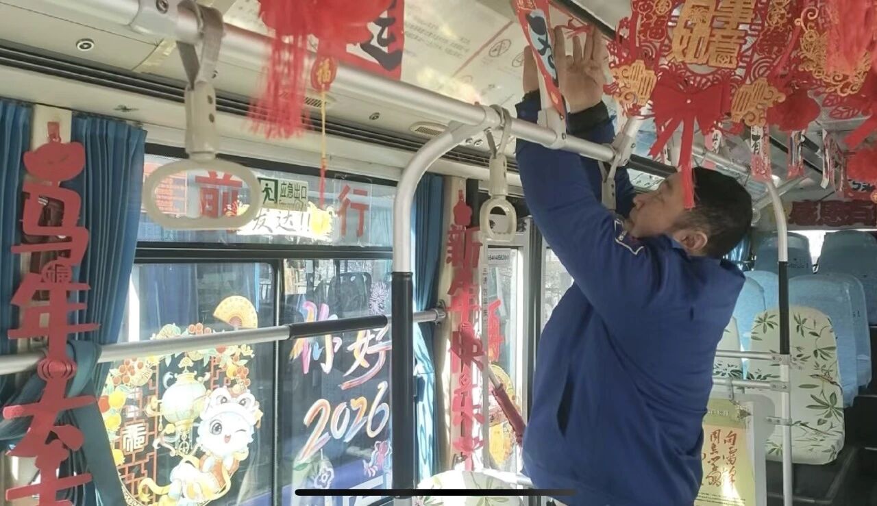 客運(yùn)集團(tuán)近期組織對(duì)所屬線路運(yùn)營(yíng)車(chē)輛進(jìn)行徹底清掃與精心裝飾。車(chē)窗上貼起福字窗花,車(chē)廂內(nèi)懸掛起紅彤彤的小燈籠,扶手欄上點(diǎn)綴著新春飾物,一輛輛公交車(chē)煥然一新。整潔明亮的車(chē)廂與喜慶祥和的裝飾交相輝映,使乘客一上車(chē)便能沉浸于歡樂(lè)的節(jié)日氛圍之中,開(kāi)啟一段充滿年味的行程。