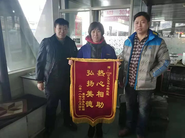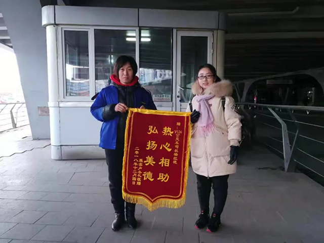 次日,盧女士懷著激動(dòng)的心情,手里捧著錦旗來到龍之夢終點(diǎn)站,親自將錦旗交給了楊紅艷手中并合影留念。